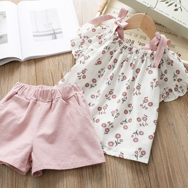 送料無料ツーピース 2点セット 上下セット ブラウス ショートパンツ 子供用 キッズ 女の子 トップス ボトムス ギャザー 肩リボン 半袖 花柄 夏服 かわいい お出かけ おしゃれ